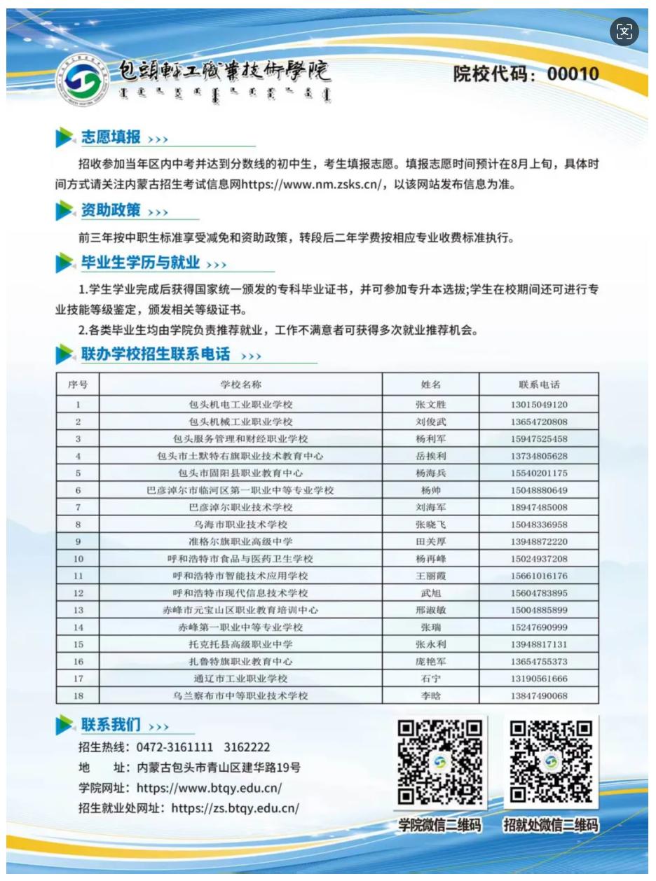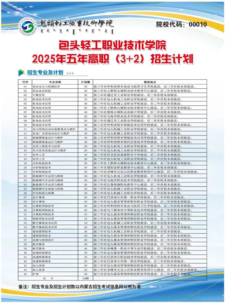 包头轻工职业技术学院2025年五年高职(3+2)招生计划