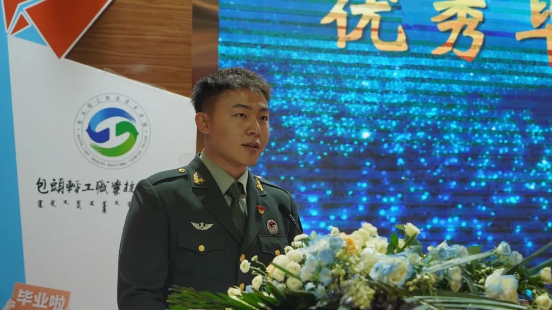 优秀毕业生代表,艺术设计系李锦韬同学身着军装,深情回顾了与轻院双向奔赴的点点滴滴,表达了对母校、老师、同学的感激之情。他回顾了自己的学习生活,坚信这些宝贵的经历使他蜕变为政治素养极高、专业技能过硬的人才,更坚信怀揣着理想,未来定有无限可能。他的言语间充满了对母校的依依眷恋,也充满了对未来的坚定信念。